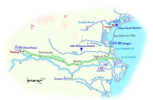 Throughout the season the 20 passenger La Bella Vita cruises between the romance and architecture of Venice, to the captivating lakeside setting of the Renaissance city of Mantua. Mantua is in central northern Italy, and has been a hub of art, culture and music for centuries. The route inland takes you along the River Po and the Bianco Canal through the Po Valley. La Bella Vita is the perfect vessel from which to immerse yourself in Italian Renaissance culture.